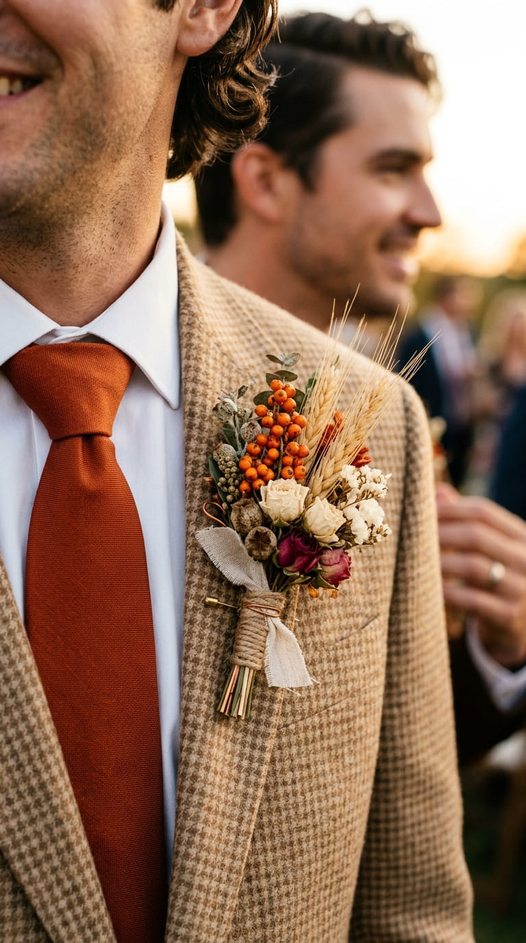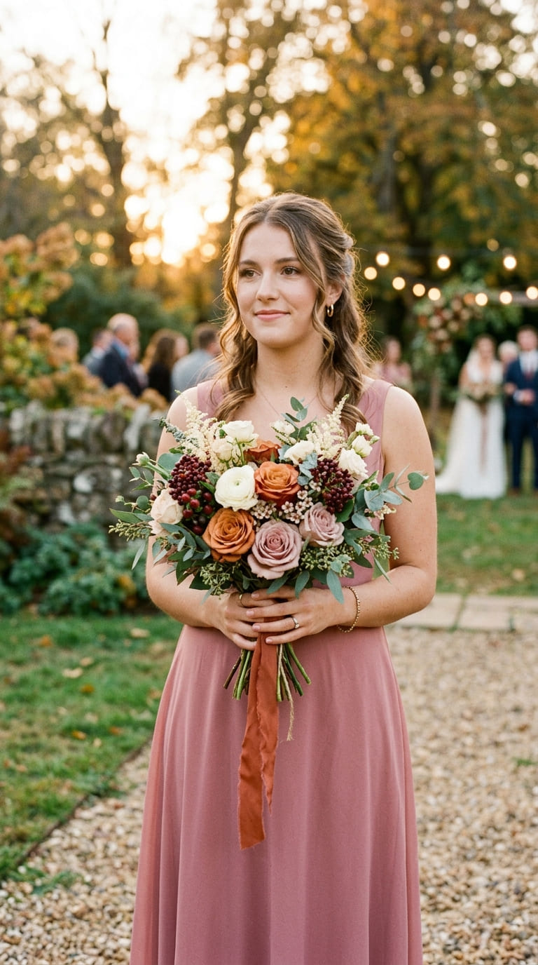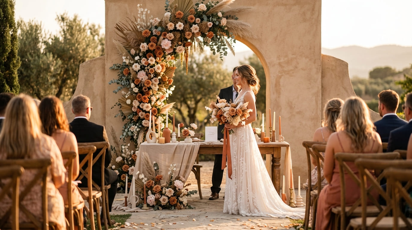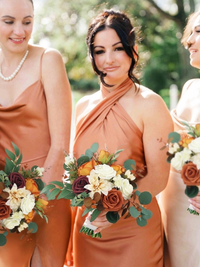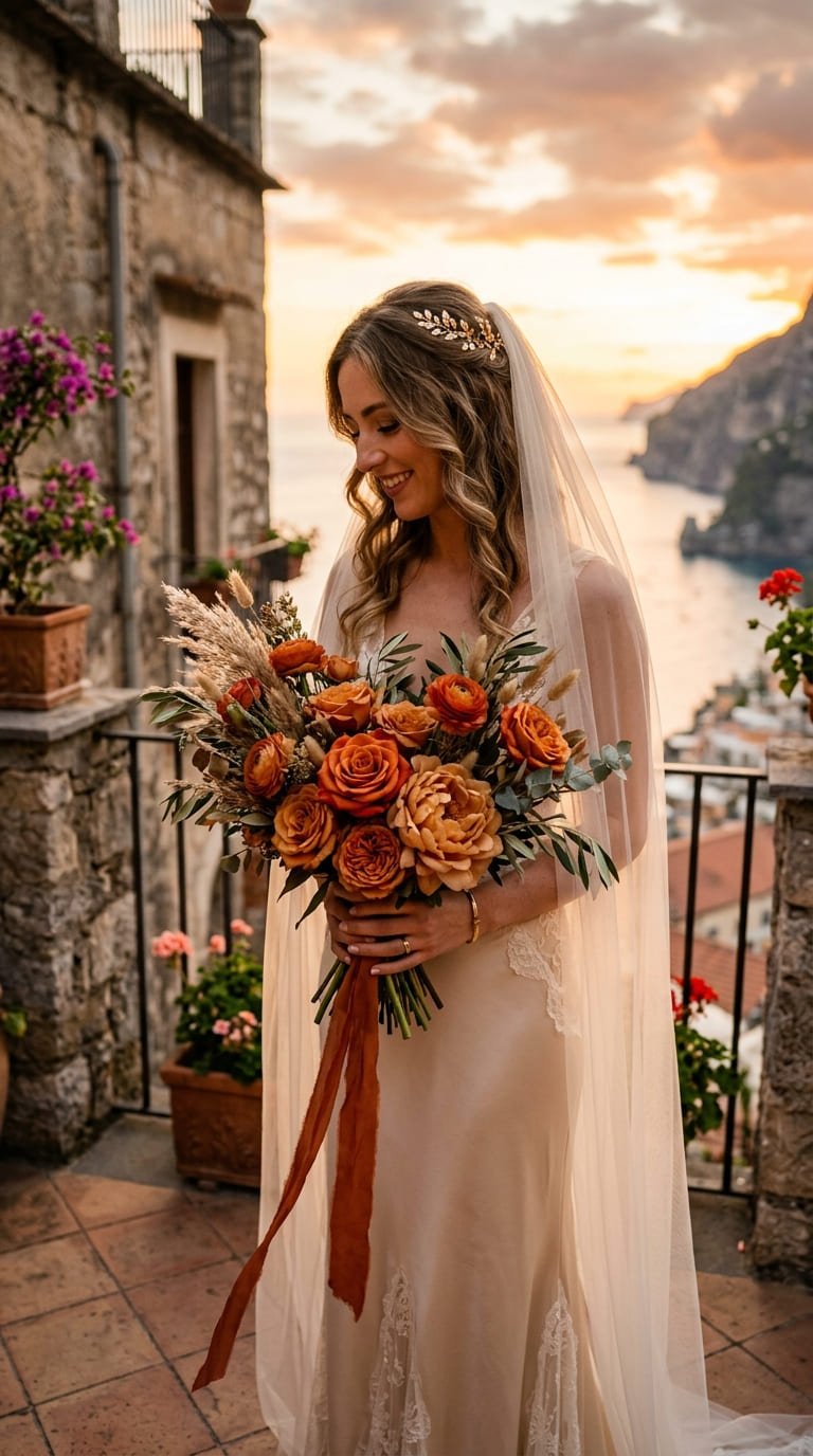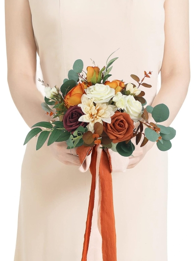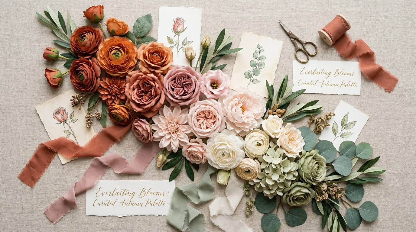 Inspired by golden hour light and sun-warmed earth tones, terracotta petals blend with champagne neutrals and soft blush undertones.