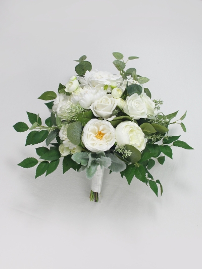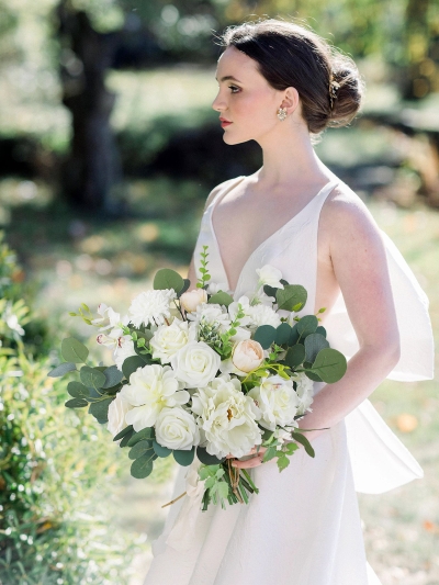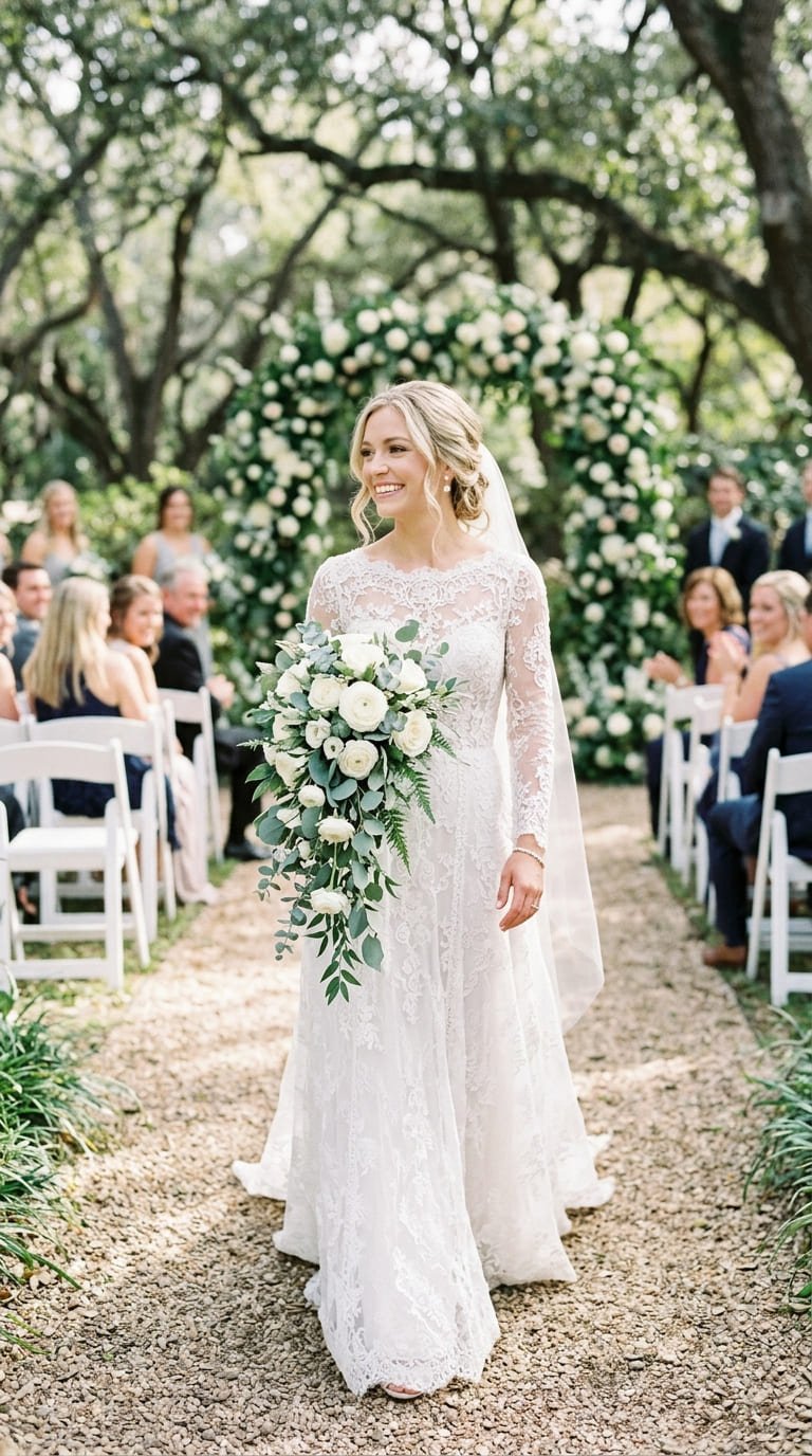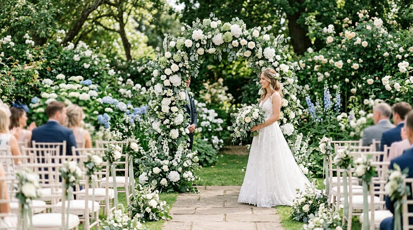 Step into a serene garden celebration where soft sage foliage meets refined white blooms.