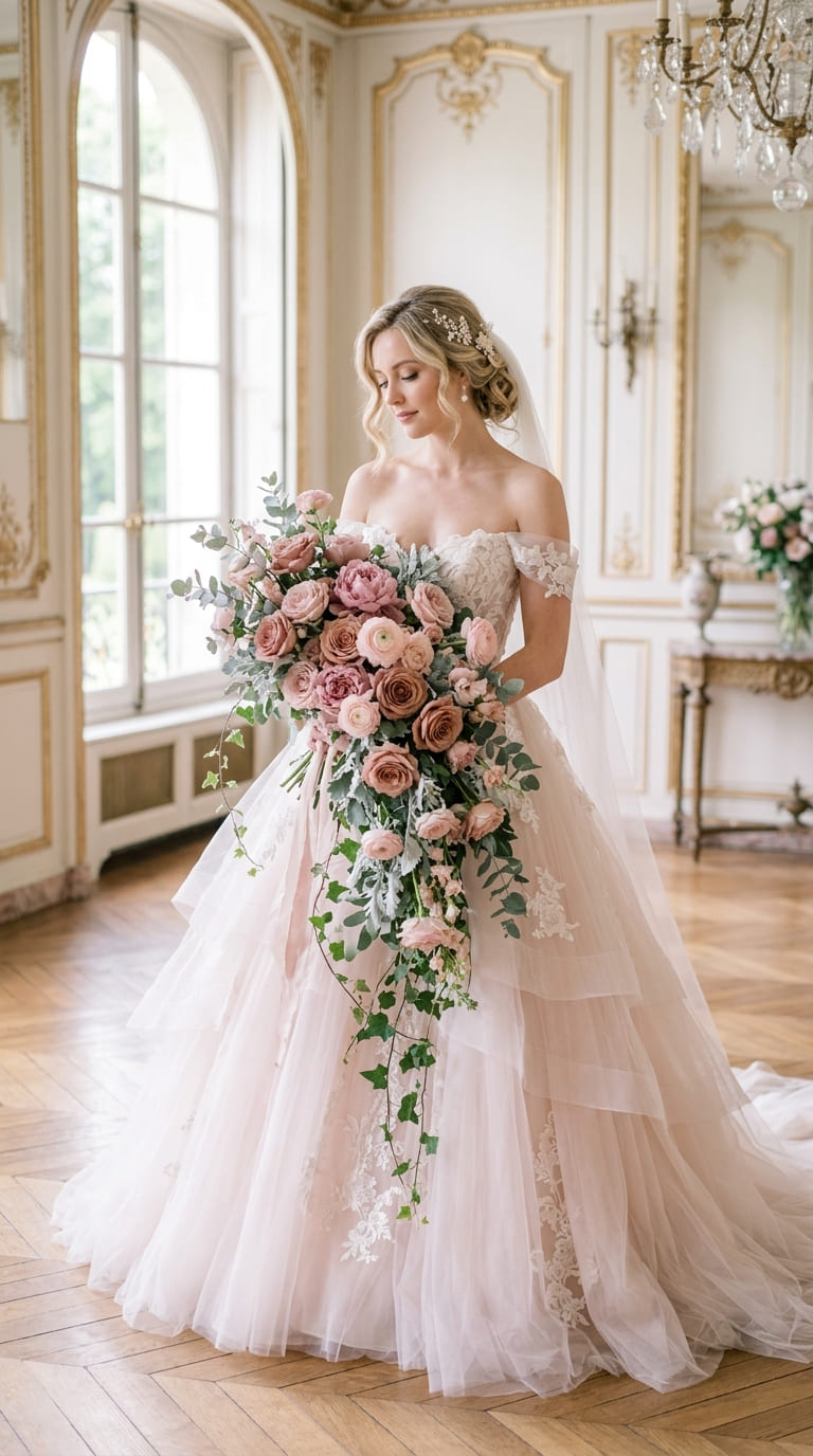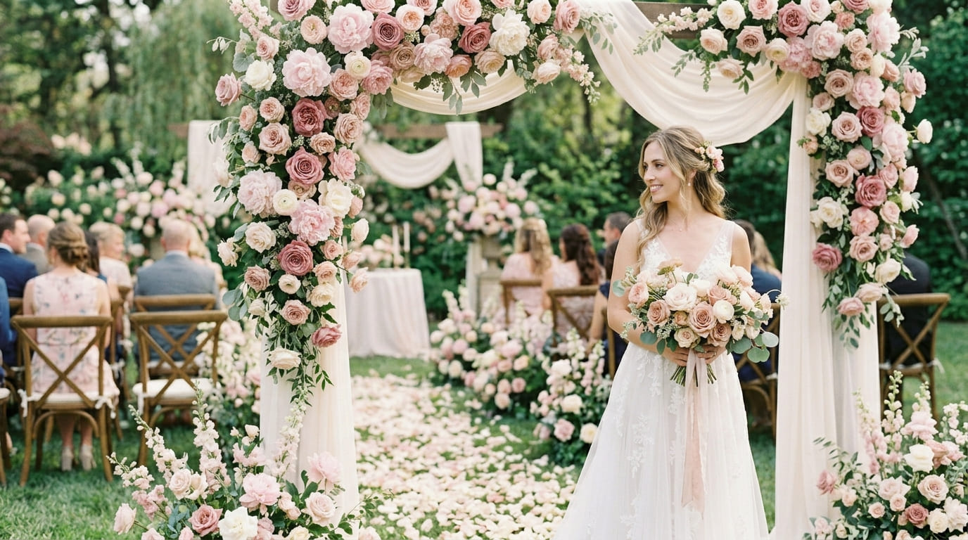 A delicate harmony of blush pink and muted dusty rose creates a wedding palette filled with softness and grace.